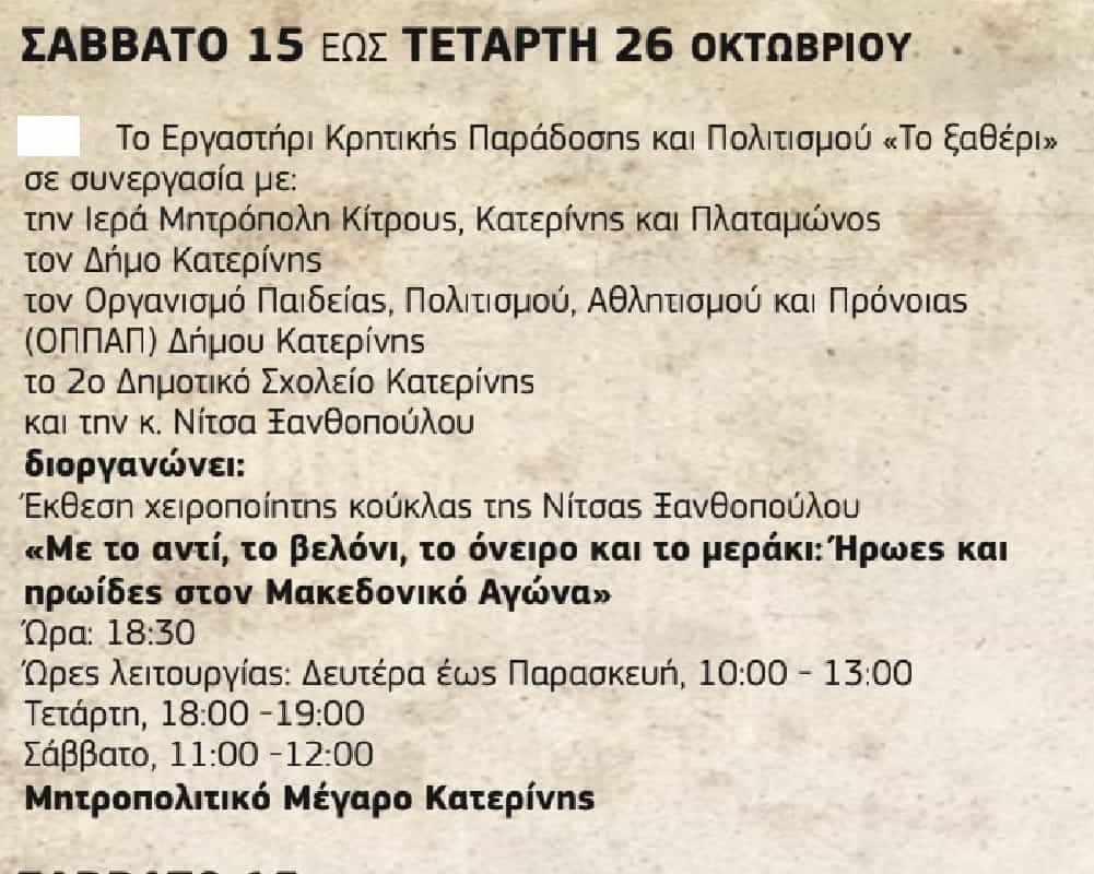 Το Εργαστήρι Κρητικής Παράδοσης και Πολιτισμού «Το ξαθέρι» τιμώντας την επέτειο του Ολοκαυτώματος στη Μονή Αρκαδίου Ρεθύμνου το 1866, διοργανώνει στο πλαίσιο των Αικατερινείων 2022 εκδηλώσεις μνήμης και τιμής για τους αγωνιστές και τους αμάχους που έδωσαν τη ζωή τους στον αγώνα για την Ελευθερία.